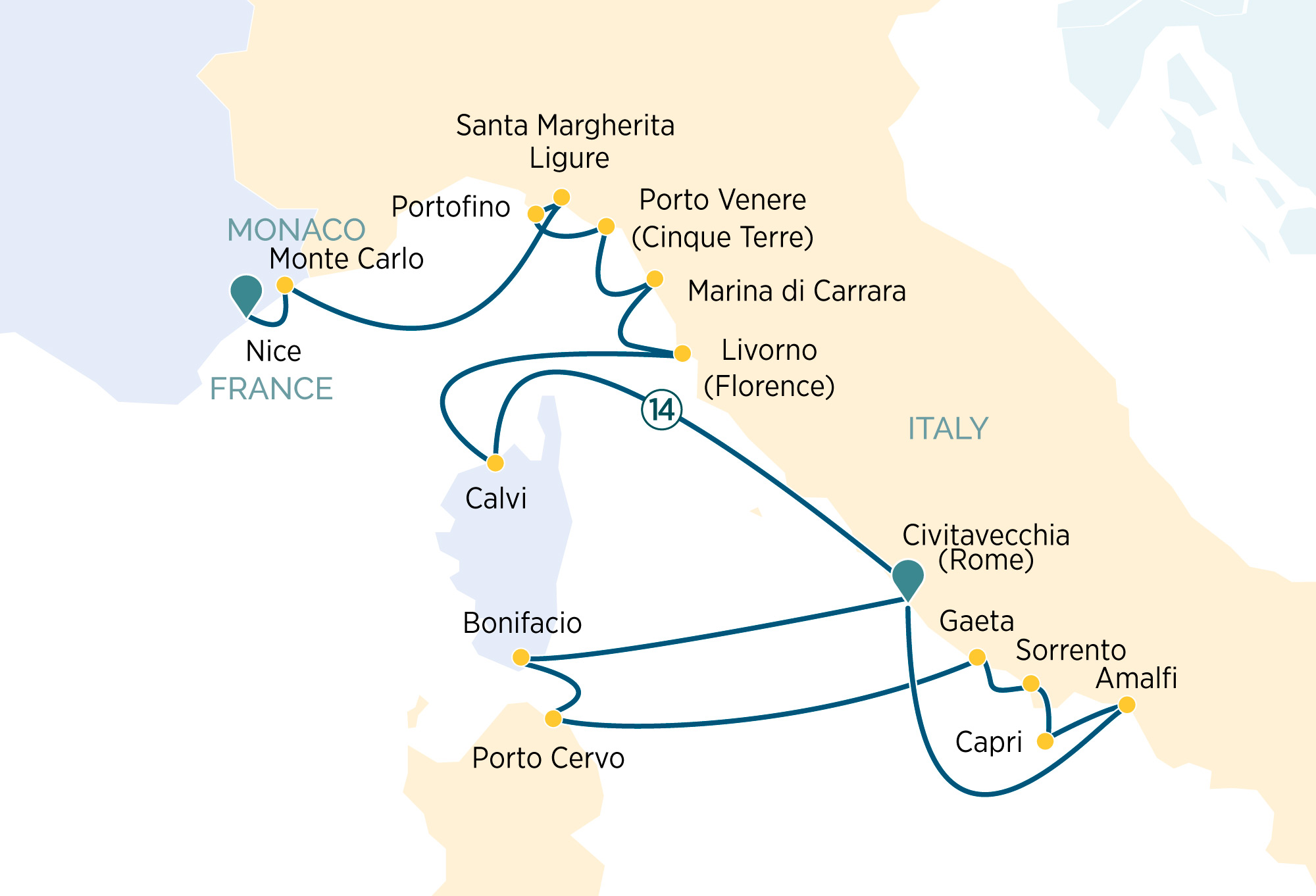 Embark on a marvellous 15-day voyage on board your Emerald Cruises luxury yacht, cruising through the heart of the Western Mediterranean and the coastal splendours of France, Italy and Monaco. On this memorable cruise, dramatic coastlines and stunning islands, timeless history and cultural charms await, as you explore this spectacular region. Your journey begins in the South of France, with visits to the charming port city of Nice and glitzy Monte Carlo, within the Principality of Monaco – a duo of dazzling gems on the glamorous French Riviera, or Côte d'Azur. Along the way, take in the delights of the alluring Italian Riviera, and picturesque Portofino and amid the gorgeous Tuscan region, discover lovely Porto Venere, a long-established haunt for artists. Admire the world-famous white marble of -Marina di Carrara and the rugged charm of French Corsica, notably, the cliffside Citadel of Bonifacio. Cruise the spectacular Amalfi Coast, dine beneath aromatic lemon trees on the fabled Island of Capri, and soak up the unmistakable Sardinian charm in upscale Porto Cervo. Uncover the iconic landmarks and ancient wonders of Italy's capital city, Rome, where your wondrous odyssey will conclude.
