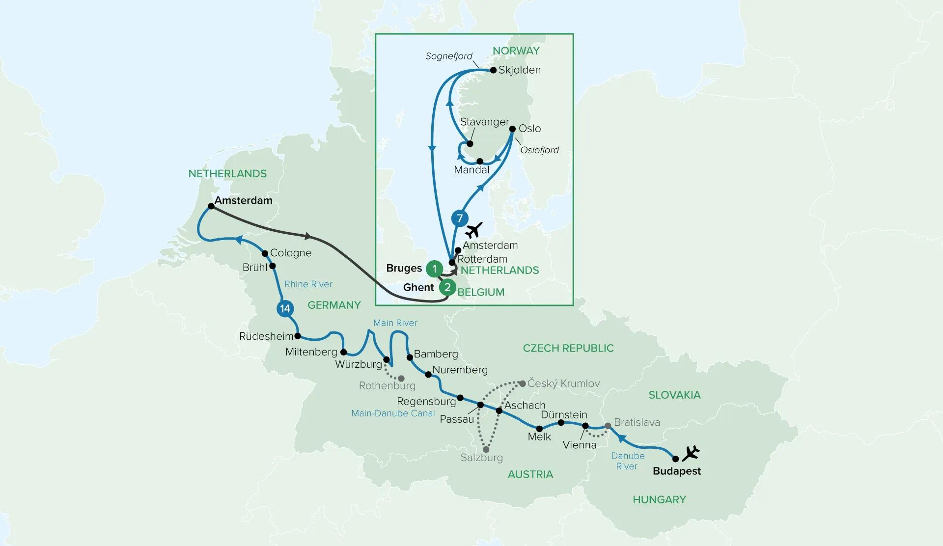 Follow Europe’s great waterways and coastlines on an expansive journey that blends river cruising, historic cities and dramatic Nordic scenery. Begin with a 14-night cruise from Budapest to Amsterdam, tracing the Danube, Main and Rhine past grand capitals, storybook towns and vineyard-lined valleys. Continue through Belgium’s medieval cities before boarding an ocean voyage to Norway, where fjords, glaciers and coastal villages reveal a strikingly different side of the continent.