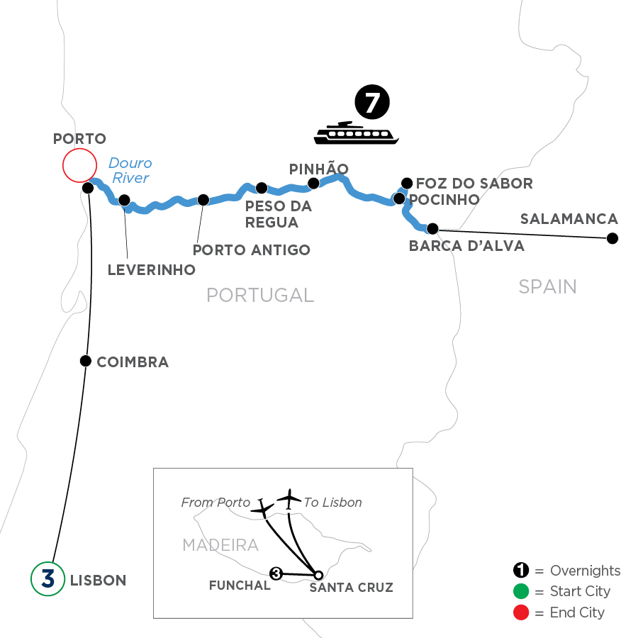 The Reign in Spain CLASSIC Join our guide for a guided tour this morning to of one of the most remote villages of the country, Freixo de Espada à Cinta village in the Douro International Natural Park, home to majestic birds of prey, OR: CLASSIC Enjoy a guided tour to the historical village of Castelo Rodrigo, which, from the top of a hill, dominates the plateau that stretches from Spain in the east to the deep valley of the Douro in the north. Stroll through its medieval streets and discover the small details that give it colour, such as the Hebrew inscriptions and crosses carved on the doorposts and voussoirs, OR:CLASSIC Get a taste of Spain with a full-day excursion to Salamanca. This Spanish city will take your breath away with its stunning streets and squares, featuring a feast for the eyes with Romanesque, Gothic, Baroque, and "Plateresque" architecture. Stroll through Christmas markets and enjoy the magical atmosphere of the city during festive time. This evening, enjoy live entertainment on board.OVERNIGHT DOCKING IN FOZ DO SABOR(B,L,D)