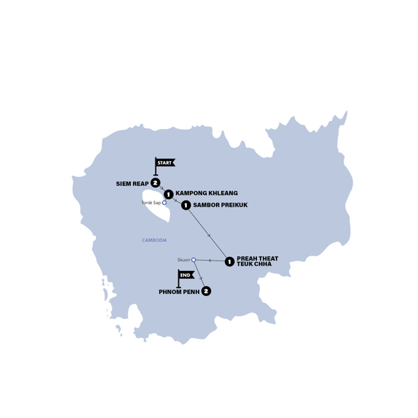 Up for a 4am wake-up call? Come visit the local fish market where the freshest catch of the day is already being bought, sold and whisked away before sunrise. After brekkie at the homestay, we’ll hop into our tuk-tuks and hit the road, covering around 80 km today — with more big-road cruising than yesterday’s off-road feel.First up: a serene Buddha temple tucked into a Tonlé Sap village. Then we’ll stop at Spean Praptos, one of the last surviving bridges from the Khmer Empire — ideal for a wander, a look at the ancient arches, and (maybe a coconut cake snack break). From there, it’s on to Sambor Prei Kuk, a town filled with pre-Angkorian temples and surrounded by seven small villages. We’ll explore both the ruins and the local life around them, with stops for Khmer noodles and local markets along the way. Back at the homestay, there’s dinner, the chance to help cook, and a laidback evening to wrap up the day.