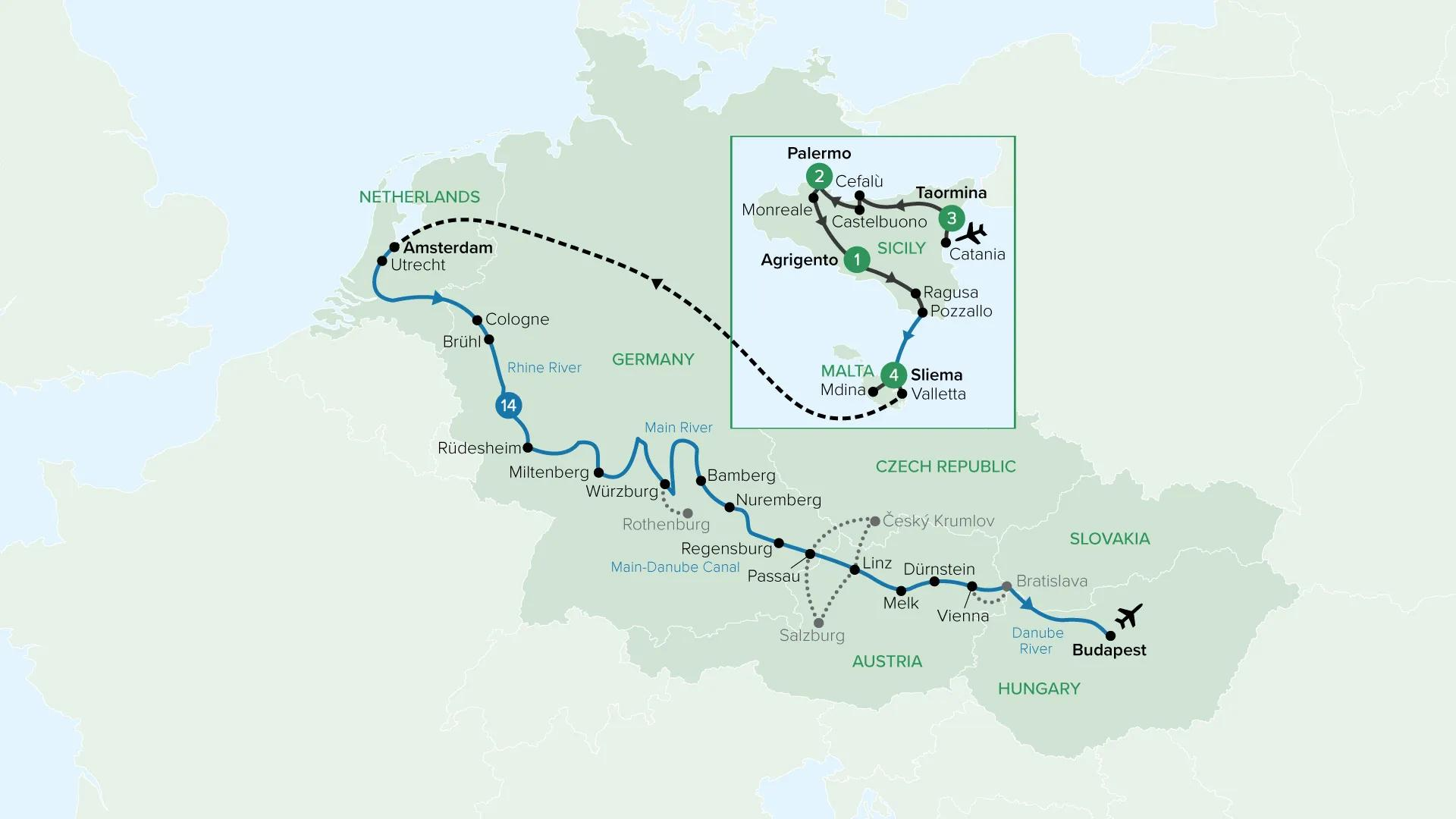 Trace a remarkable path across Europe, beginning on the sunlit shores of Sicily and Malta on a small group tour, where Mount Etna, Taormina and the baroque streets of Valletta set the scene. Then fly to Amsterdam to board your river ship and cruise through the heart of the continent, passing castle-lined valleys, medieval towns and grand capitals including Vienna and Budapest.