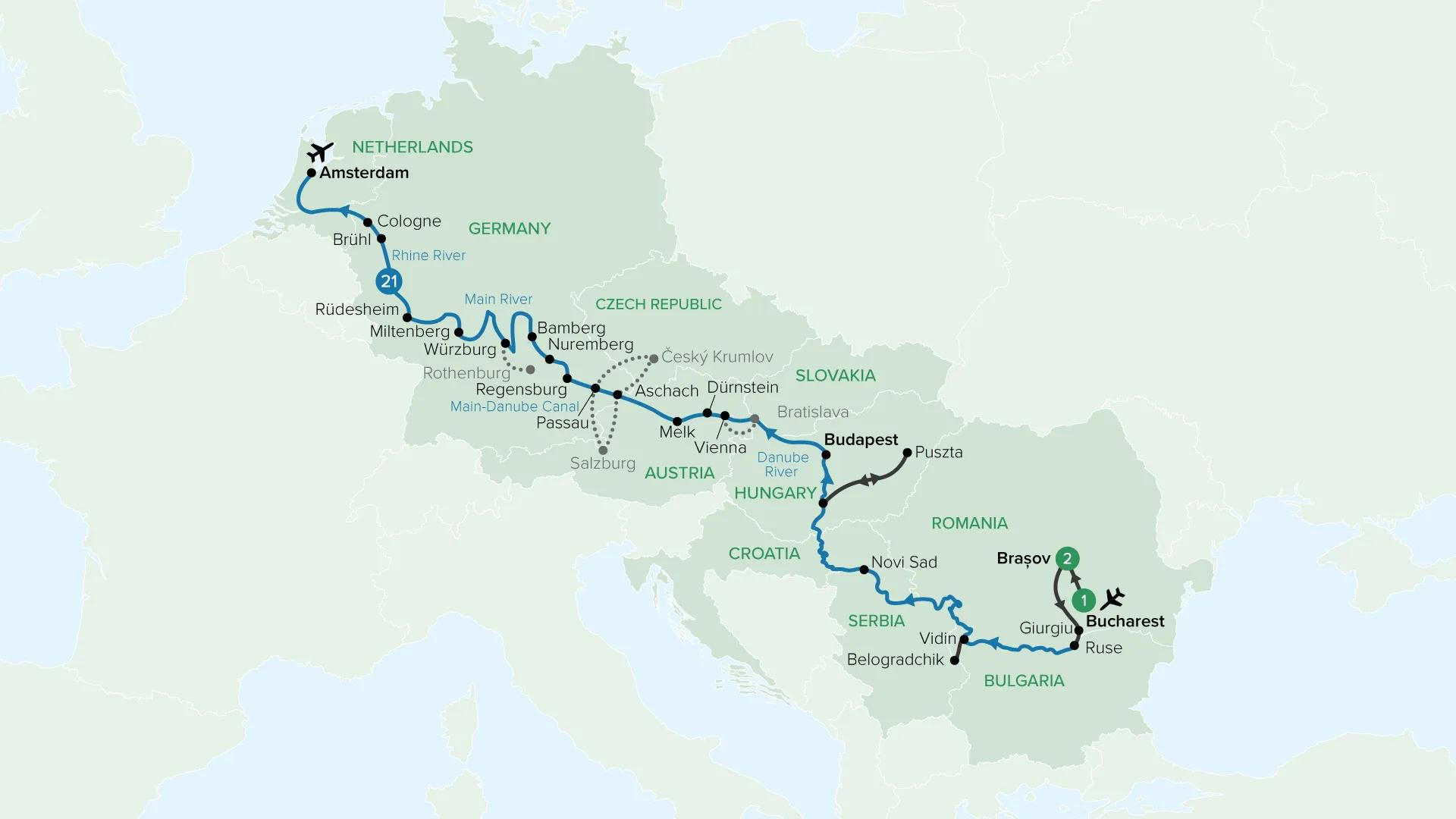Begin in vibrant Bucharest and trace the Danube westward through the heart of Eastern and Central Europe to Amsterdam. Discover grand capitals, historic fortresses and charming riverside towns as you travel from the Balkans and Hungary to Austria and Germany, before cruising the scenic Rhine to the Netherlands. Along the way, Travelmarvel's hallmark touches reveal the region’s rich heritage and culture.