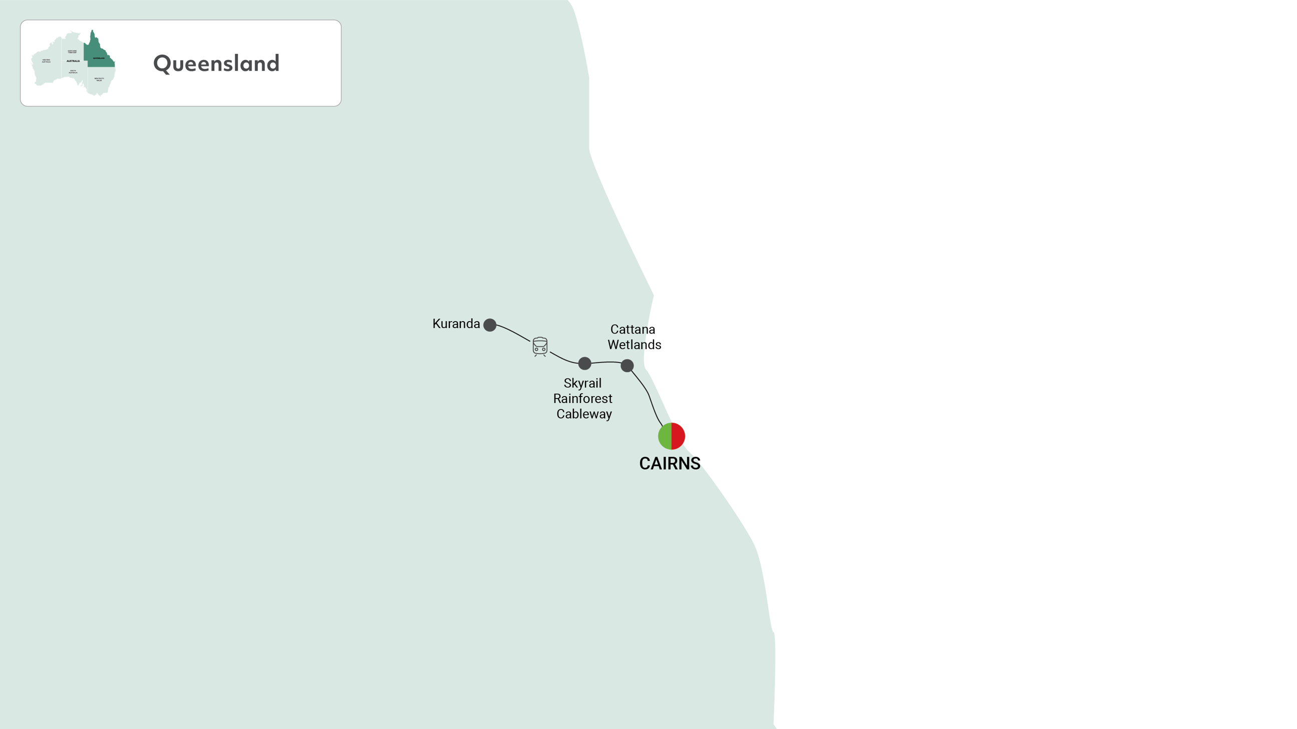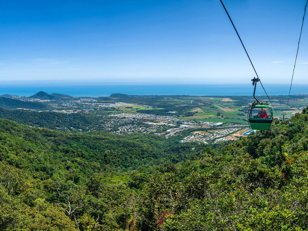 The journey begins on board a luxury coach from Cairns to Cattana Wetlands. Enjoy a driver-guided walk that takes you through the heart of a remnant feather palm forest. Traverse the unique landscape, absorbing the tranquil ambience as you pass by the reflective Jabiru Lake and gain insights into the unique flora and fauna that call this wetland home. Then, enjoy an exclusive Make Travel Matter® experience. Visit the awe-inspiring Barron Falls, known locally as Din Din. This magnificent waterfall holds profound significance to the Djabugay Aboriginal People, and your experience goes beyond the surface as you receive a warm welcome from a Djabugay cultural guide and hear about the spiritual and historical importance of the falls in their heritage. For lunch, visit Skybury, Australia’s oldest coffee plantation and largest papaya grower. Enjoy a tropical lunch with Skybury’s signature touches and journey through the Tablelands rich farming area to Emerald Creek Ice Creamery, for a tasting of different ice-cream flavours. In the afternoon, board the Skyrail Rainforest Cableway and journey from Kuranda over the World Heritage listed Tropical Rainforest. Enjoy spectacular views across the Barron Falls from The Edge lookout and learn about the rainforest’s evolution in the CSIRO Rainforest Interpretive Centre. At Skyrail’s Smithfield terminal, meet your coach for return journey to Cairns.