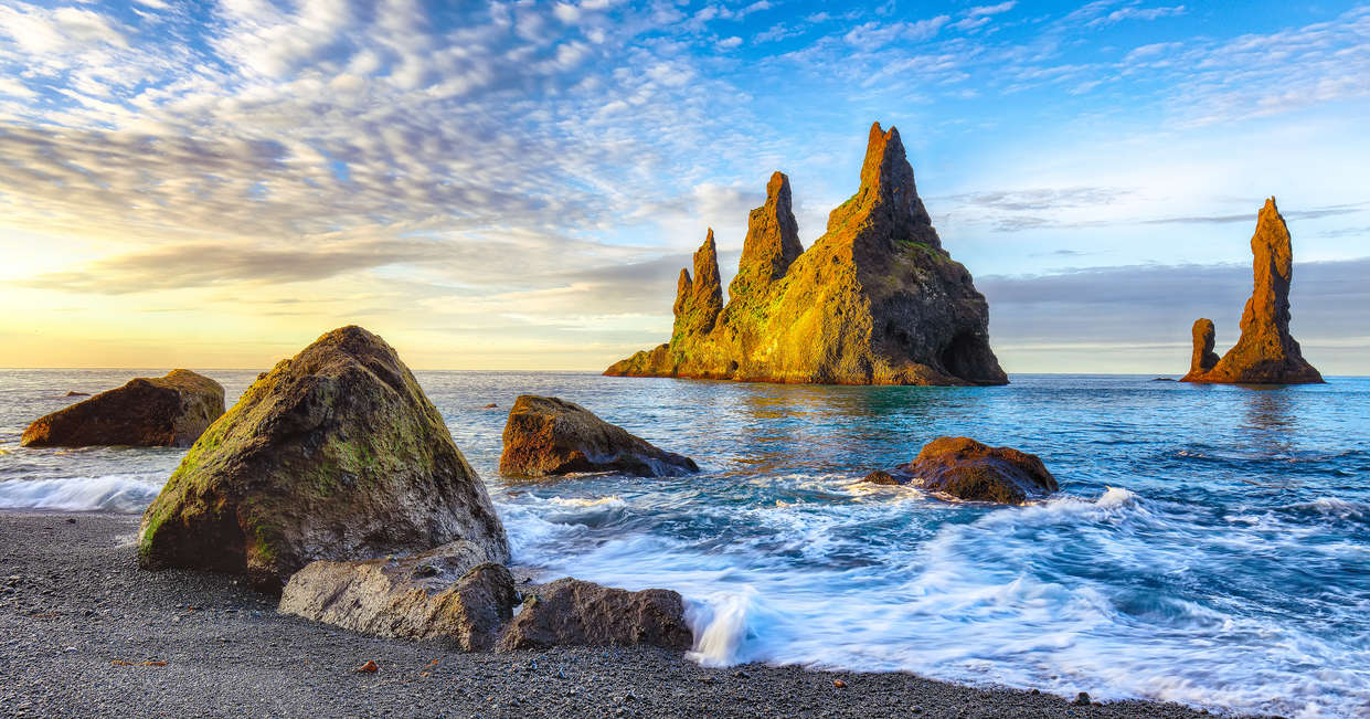 We'll also stop at Vik I Myrdal, a rocky beach with incredible basalt cliffs that are said to have inspired Reykjavik's impressive cathedral. The beach is often incredibly windy and there are great photo opportunities of the waves crashing against the cliffs. We'll take a short walk to the beach and from the shore, we'll see the oddly shaped Reynisdrangar stacks out in the ocean and if we're lucky, we'll spot the resident puffins, fulmars and guillemots.
