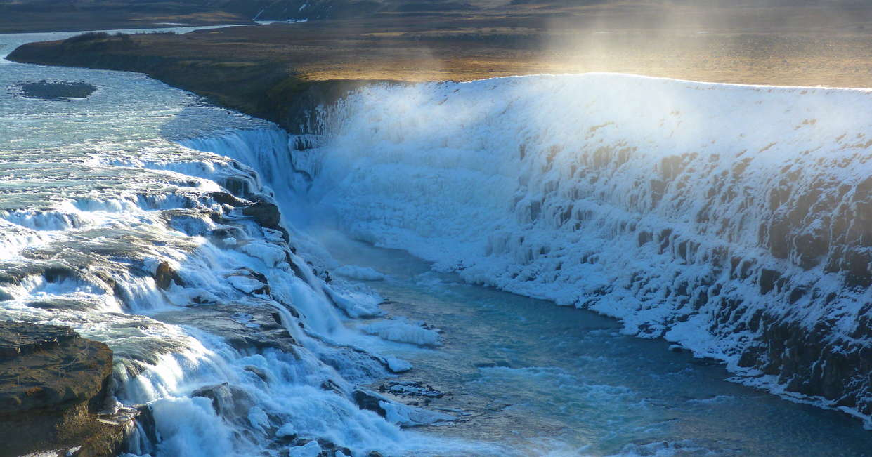 We'll leave the mountains behind and spend the afternoon discovering Iceland's waterfalls. Starting with Godafoss, known as 'the waterfall of the gods', it's particularly spectacular in winter when the clear blue waters partially freeze.