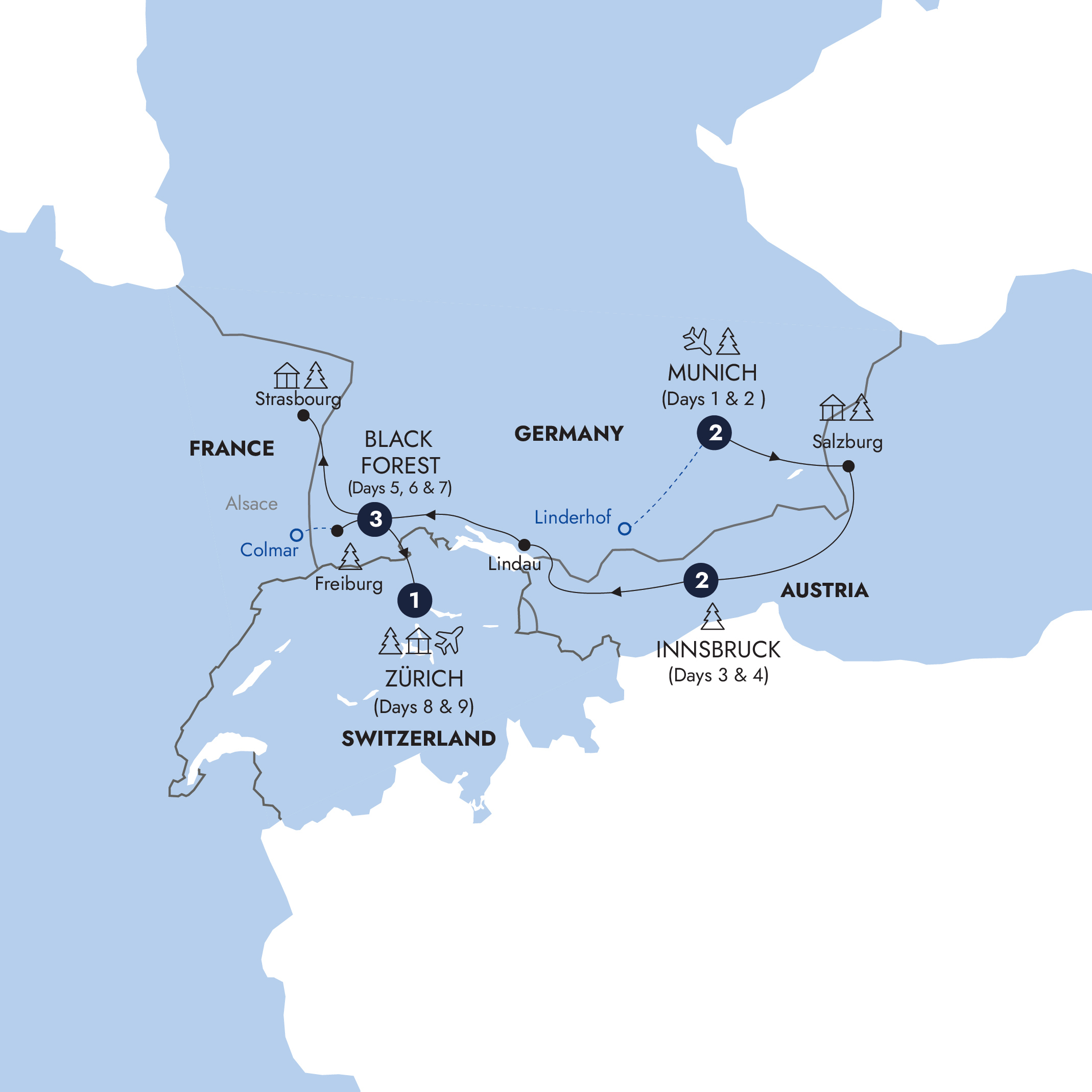 Travel past Lake Chiemsee, often called the Bavarian Sea, en route to Salzburg. With your Local Expert, stroll through the baroque Old Town and visit Mozart’s Birthplace on Getreidegasse. Inside, enjoy a rare musical demonstration on his original pianoforte, a moment that brings Salzburg’s most famous son vividly to life. Afterwards, explore the city’s renowned Christmas markets and enjoy a warming Glühwein, a traditional mulled wine dating back to the 15th century, with your Travel Director. Explore the market with your free time where you can browse handcrafted decorations and shop for local delicacies. Continue to Swarovski Crystal World, a visionary museum and art space conceived by André Heller to celebrate the artisanship and creativity of the Swarovski legacy.