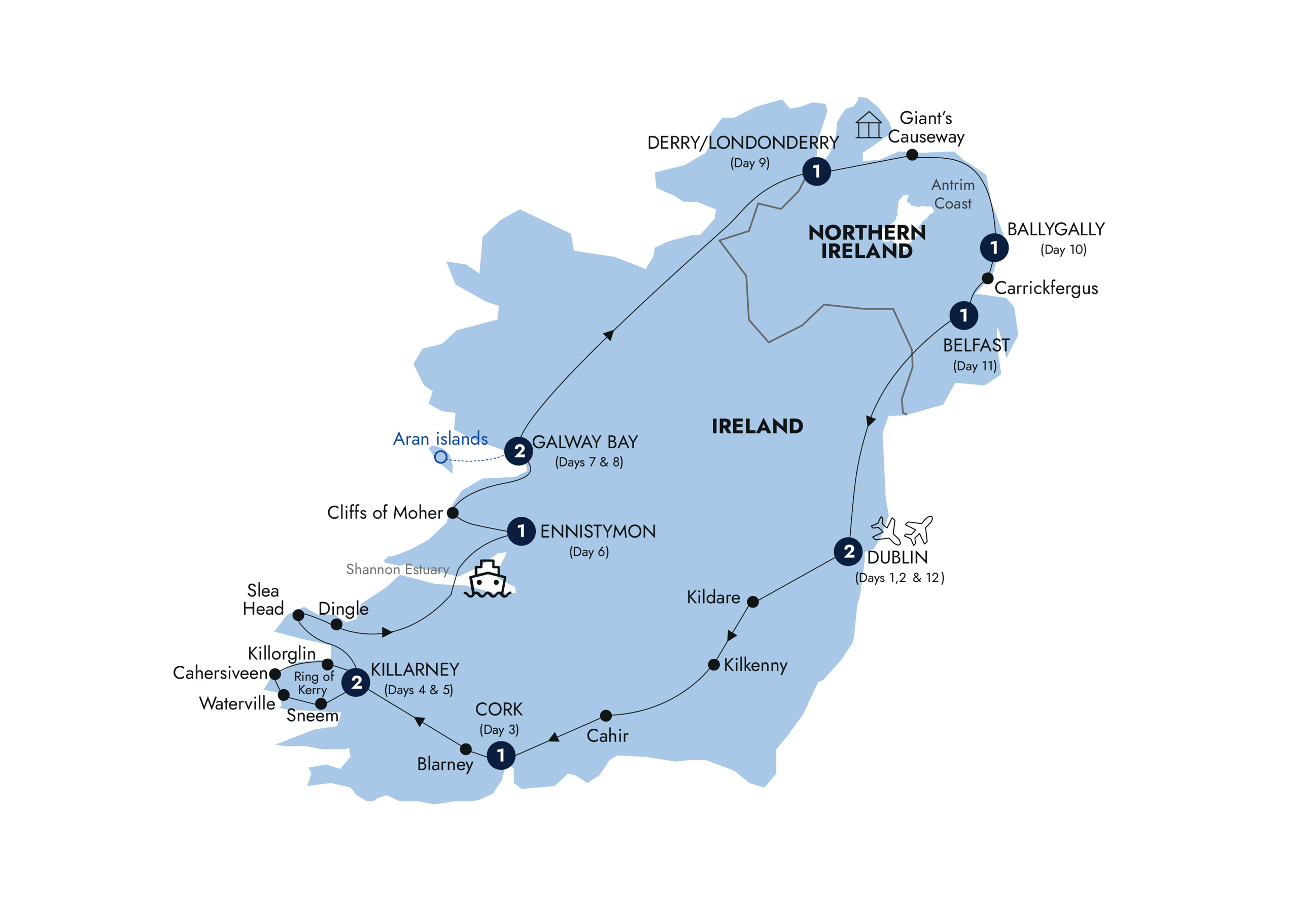 Start your day with Insight Choice. Choose a memorable ride on a horse-drawn jaunting car with the local jarveys. Alternatively, join a gentle hike with a Local Expert along the lake shore and past the grounds of Ross Castle, admiring the incredible scenery of the National Park. While there aren't any mountains to climb, walkers should be fit, have good walking shoes or boots, sunscreen and rain gear. Then explore around the magnificent Ring of Kerry. Here, mountains, valleys, lakes and sea blend into a landscape that is breathtaking beyond words. Journey past lush lakelands and around towering cliffs as you appreciate sweeping sea views. Continue through delightful villages like Sneem and cross the peat bogs of the Black Mountains to Moll’s Gap to admire Queen Victoria’s Ladies View. The rest of the afternoon is at leisure. Maybe take the opportunity to hire a bicycle and enjoy one of the many scenic trails around the lake or through the National Park.