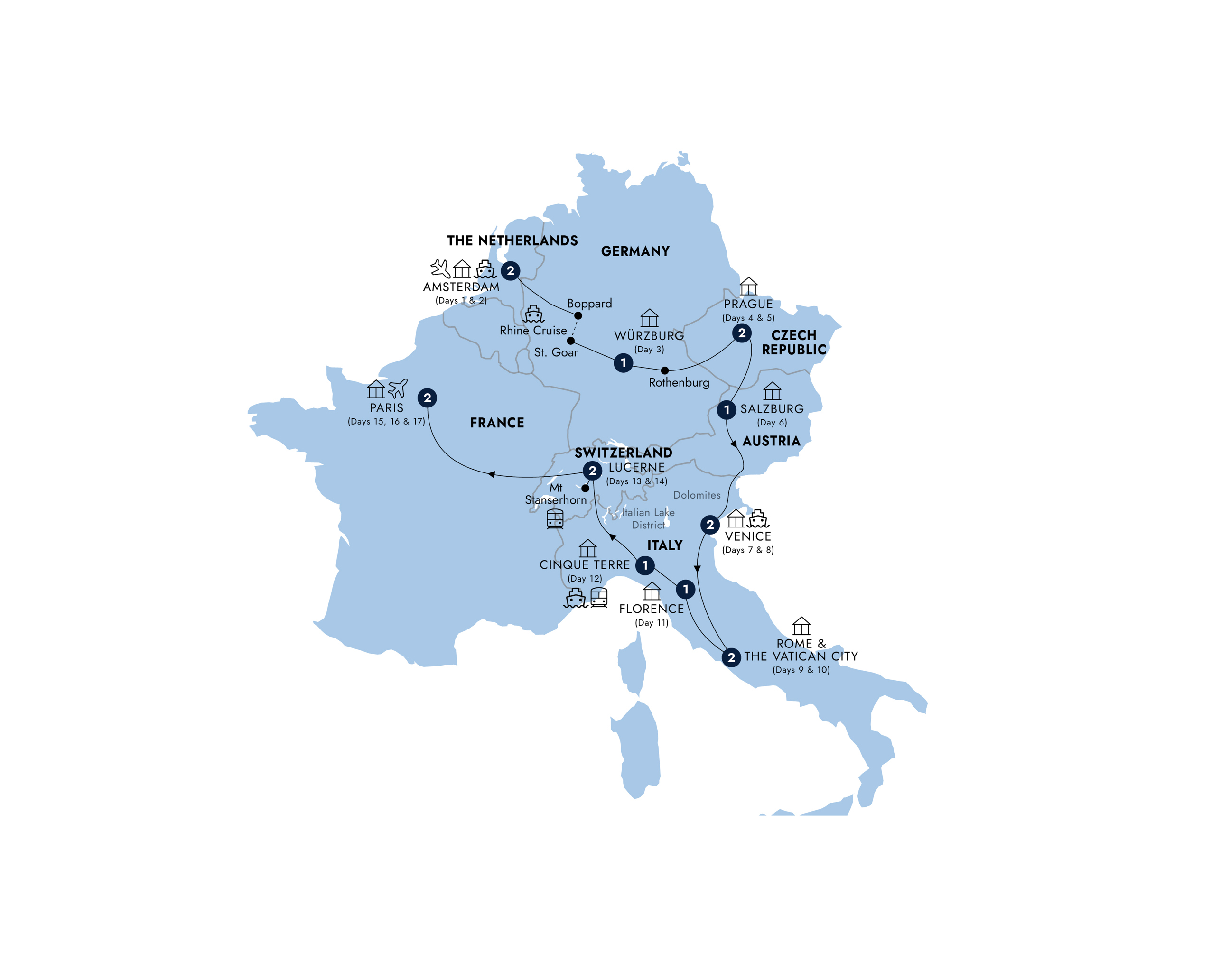 From Amsterdam to Rome and onto Paris, this grand tour takes in Cinque Terre, abundant Florence sightseeing and a delectable Lucerne Dine Around evening. Start your tour with a curated cruise through the canals led by local experts—the perfect introduction to the Netherlands. Onwards in style into Germany, the Rhine's UNESCO world heritage sites give way to the golden city of Prague—where your local guide will lead you through the hilltop castle courtyards and the grandiose St Vitus Cathedral or through the Jewish Quarter. A tour of Italy serves up the gondola-filled canals of Venice and the opulence of Rome, before Swiss delights beckon in Lucerne. Paris dazzles last with a chance to shop the city's boutiques like a local and enjoy views of iconic sights, including Notre-Dame and the Louvre.