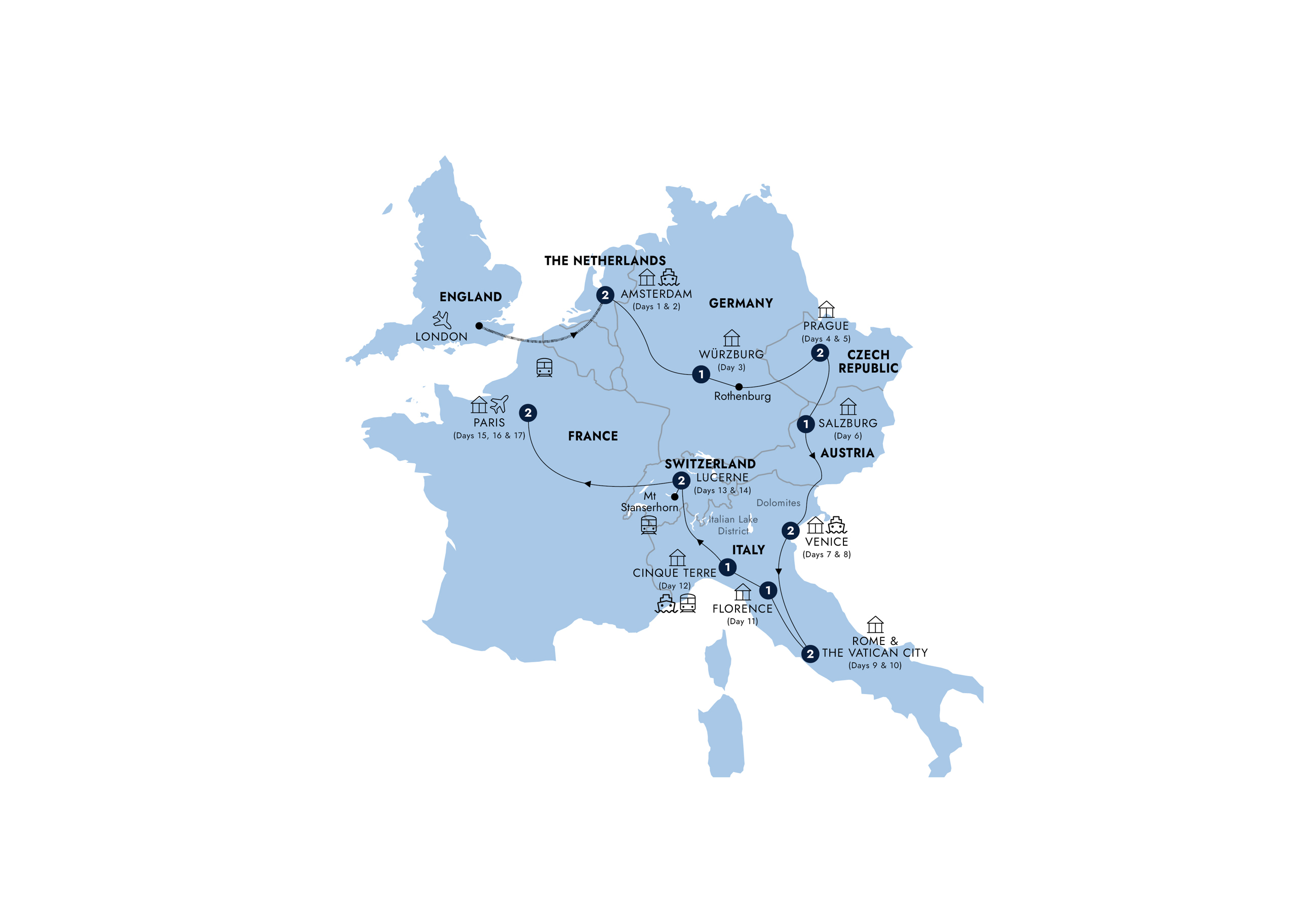 From London to Rome and onto Paris, this grand tour takes in Cinque Terre, abundant Florence sightseeing and a delectable Lucerne Dine Around evening. After speeding from London to Amsterdam aboard Eurostar, the perfect introduction to the Netherlands is a curated cruise through the canals led by local experts. Onwards in style into Germany, the Rhine's UNESCO world heritage sites give way to the golden city of Prague—where your local guide will lead you through the hilltop castle courtyards and the grandiose St Vitus Cathedral or through the Jewish Quarter. A tour of Italy serves up the gondola-filled canals of Venice and the opulence of Rome, before Swiss delights beckon in Lucerne. Paris dazzles last with a chance to shop the city's boutiques like a local and enjoy views of iconic sights, including Notre-Dame and the Louvre.
