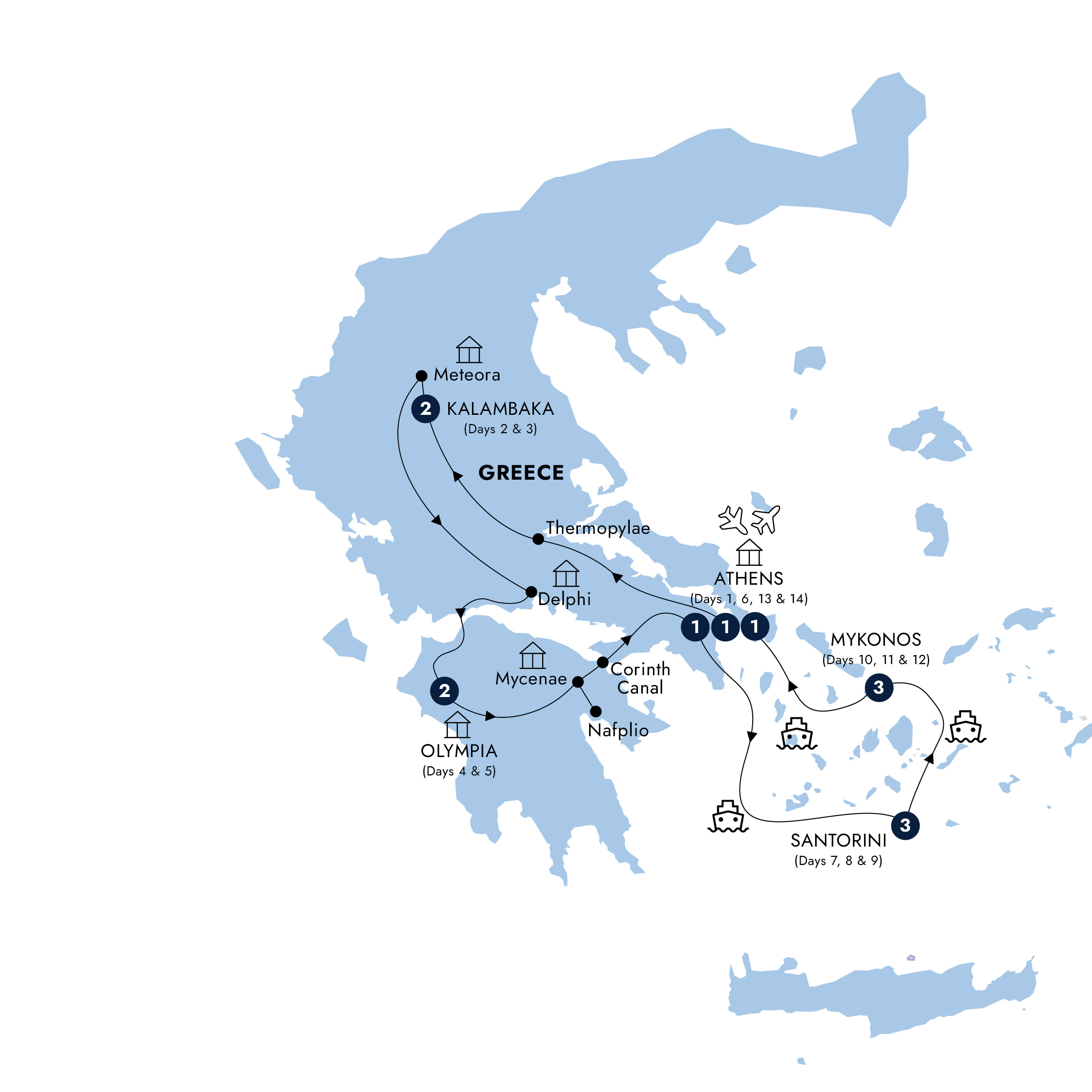 Visit the ruined city of Mycenae with a Local Expert. Walk through the Lion Gate, visit the royal beehive-tombs and see the giant Cyclopean stones used to build the city walls. Travel to the elegant town of Nafplio, known for its beautiful architecture, colourful shops and cafes. Join a MAKE TRAVEL MATTER® Experience as you meet Maria and her daughter to learn about the ancient techniques of hand weaving. Your journey continues, following the shores of the Saronic Gulf to pass the Corinth Canal, dividing the Peloponnesse and mainland Greece, and arriving in Athens. In the evening, enjoy a hearty dinner in true Greek style, complete with wine and good cheer.