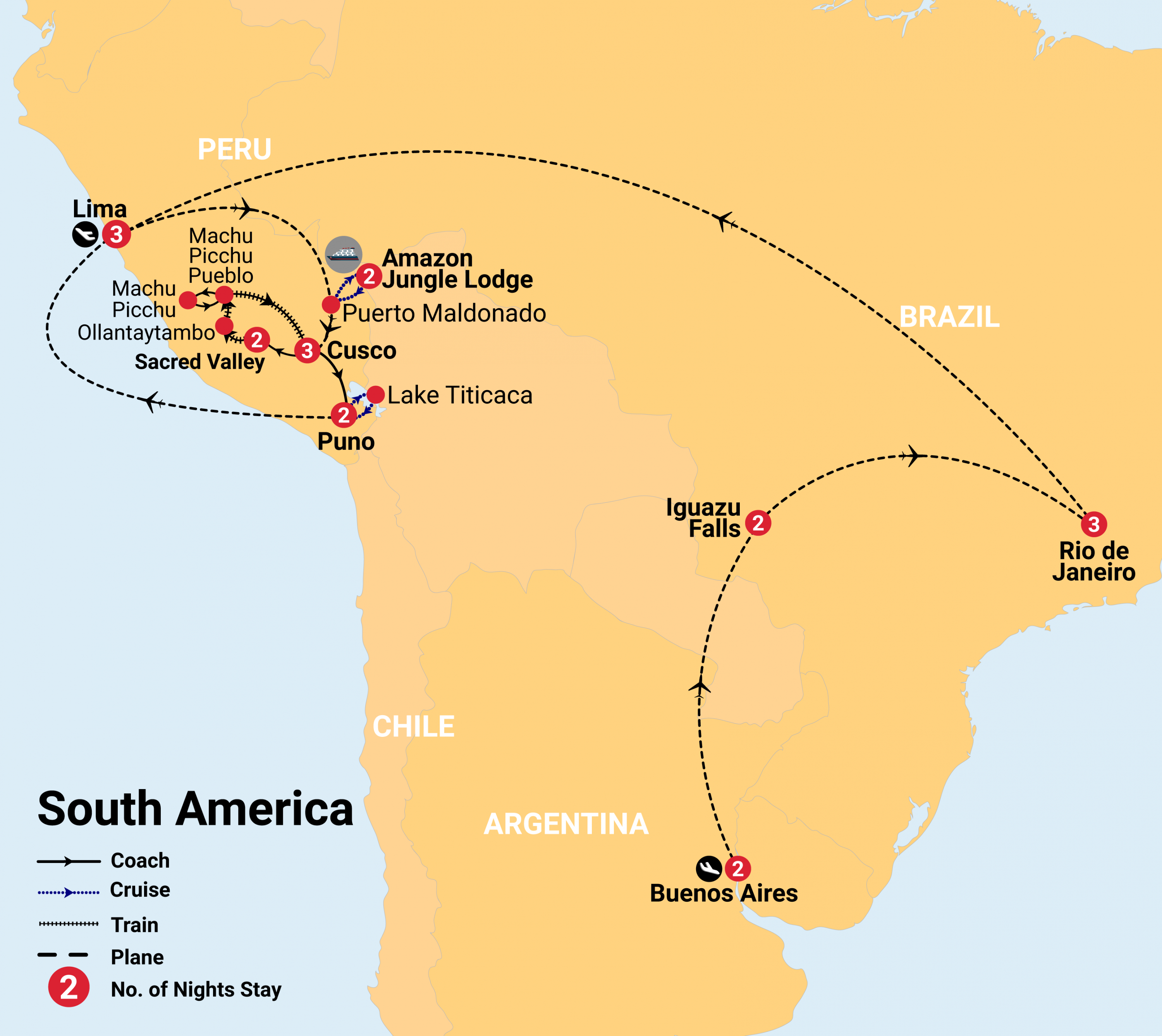 - 19 nights in 3 & 4-star hotels, including 2 nights at an eco-friendly Peruvian Amazon lodge