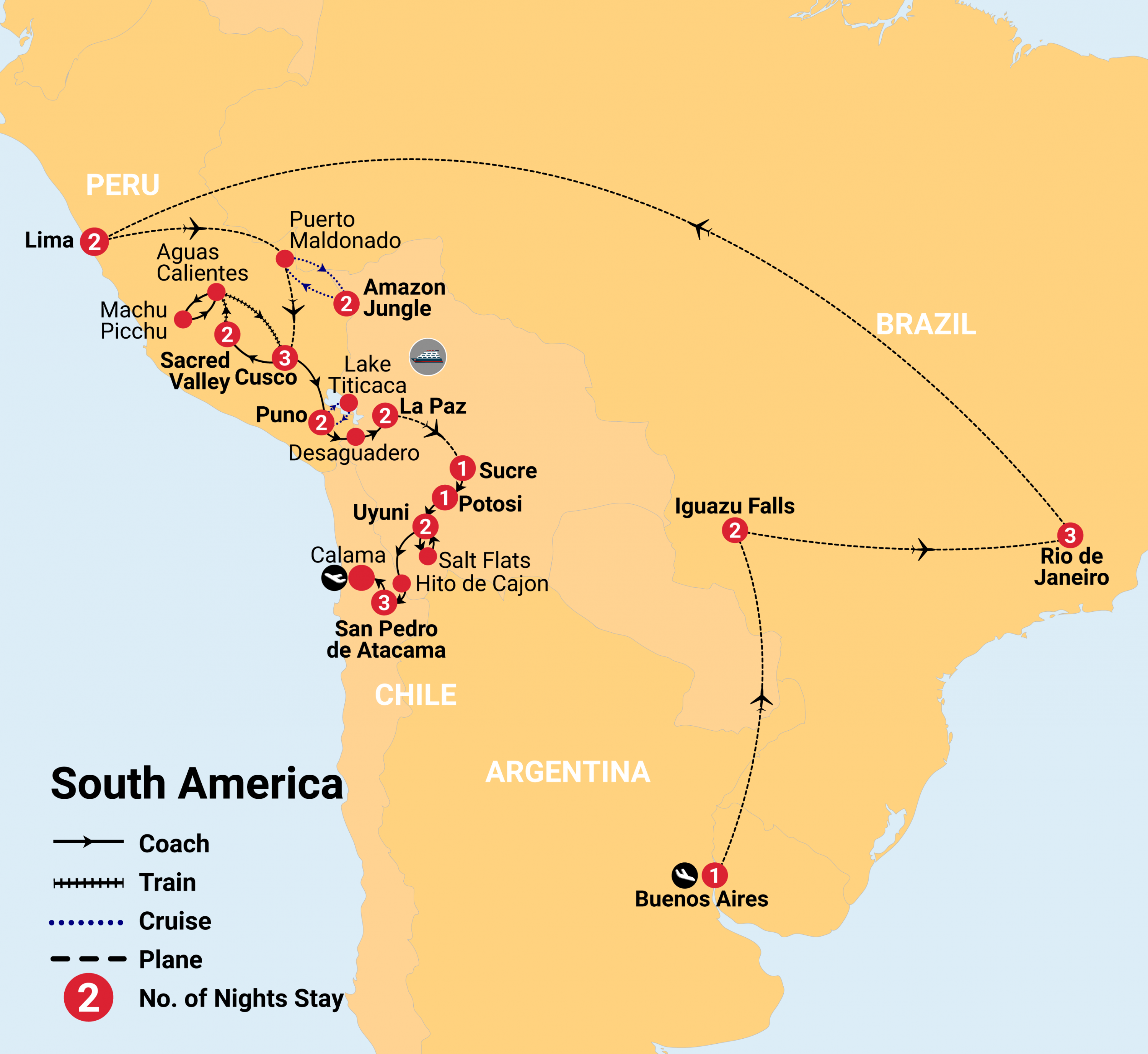 - Incredible sightseeing, including the Inca treasure Machu Picchu, the Peruvian Amazon jungle, Iguazu Falls, islands of Lake Titicaca, glamorous Buenos Aires and vibrant Rio de Janeiro, experience breathtaking scenery of the Uyuni Salt Flats, geysers, mountains and lagoons of the Bolivian high plateau, and explore the stunning Atacama Desert region