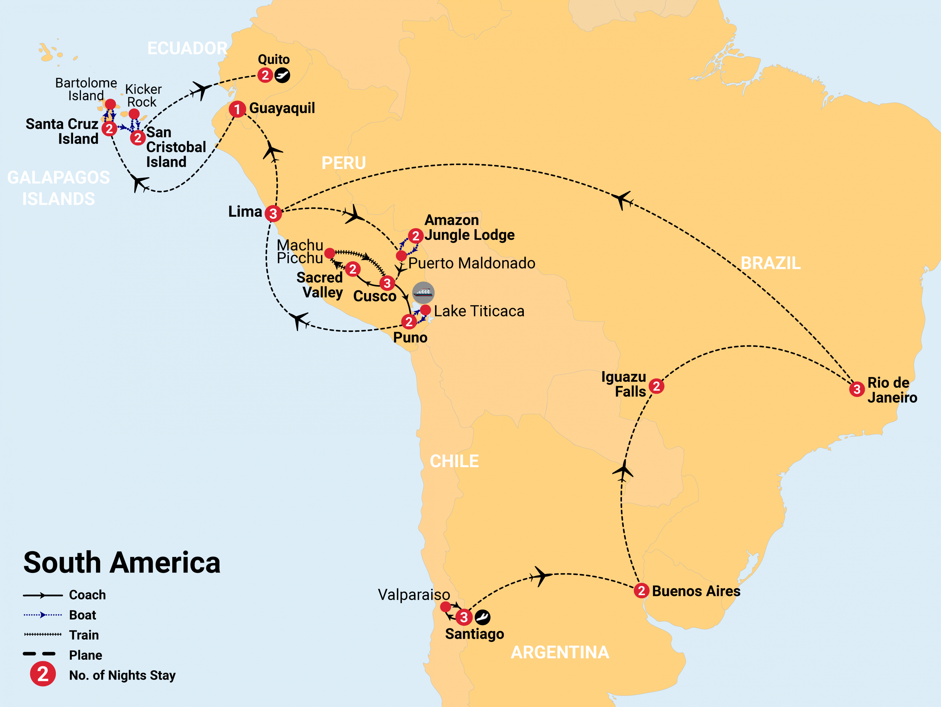 Embark on a vibrant journey through South America, beginning in Santiago’s rich history. Explore Buenos Aires' tango-filled streets, then marvel at Iguazu Falls. Soak in Rio's iconic beaches and Christ the Redeemer, before discovering Peru's ancient wonders like Machu Picchu. Conclude in the serene, wildlife-rich Galapagos Islands.