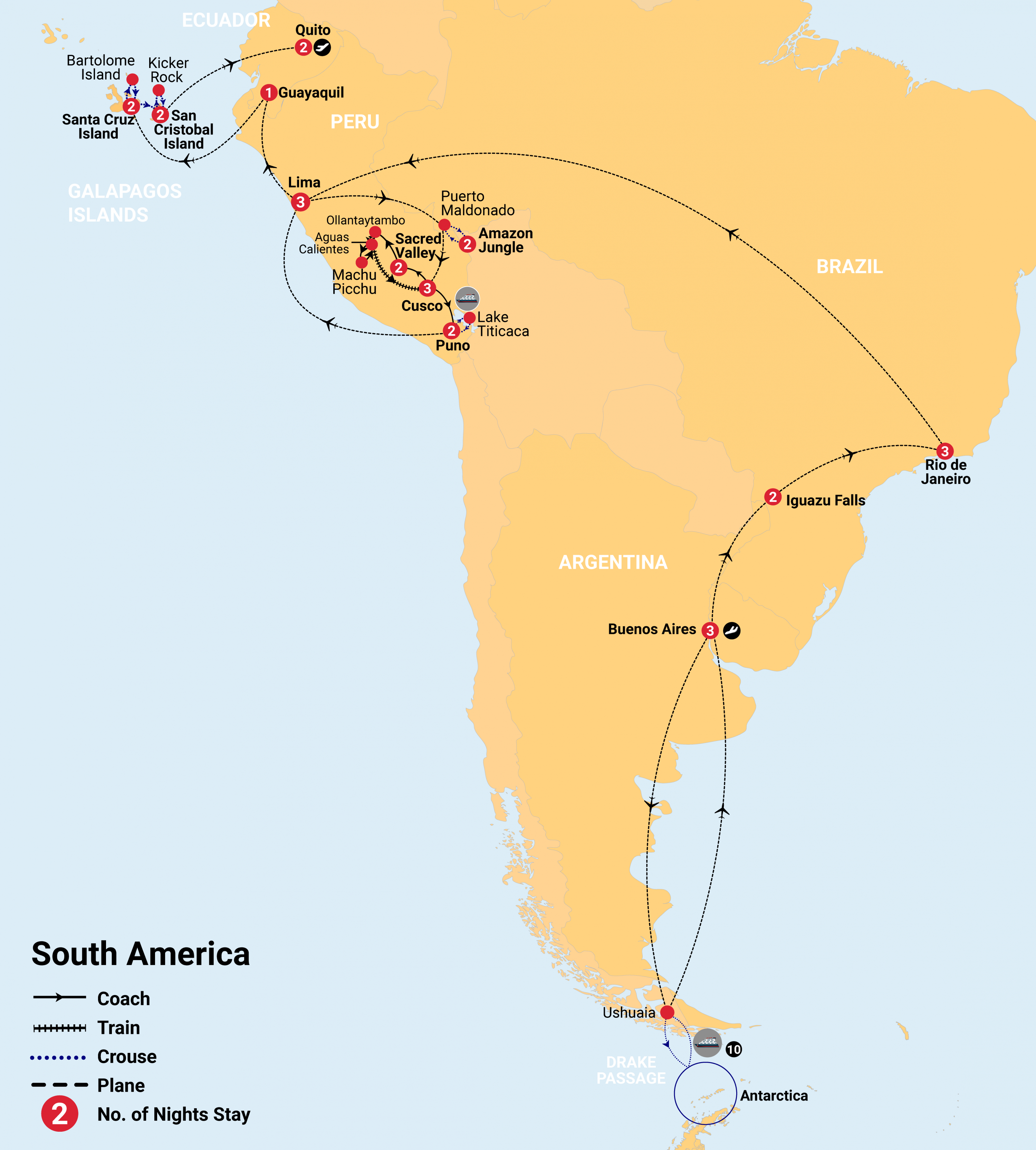 - 37 nights accommodation, including 10 night Antarctica cruise and 2 nights at a eco-friendly Peruvian Amazon lodge