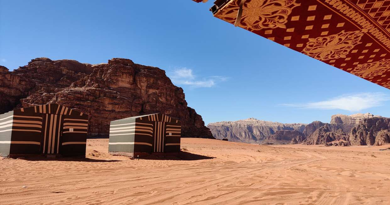 Tonight, we'll sleep in traditional Bedouin tents, crafted from goat hair which offers the best protection against the extreme desert climate. Each individual tent comes with rugs, mattresses, pillows, and blankets provided. There's a toilet and shower block at the end of the site.