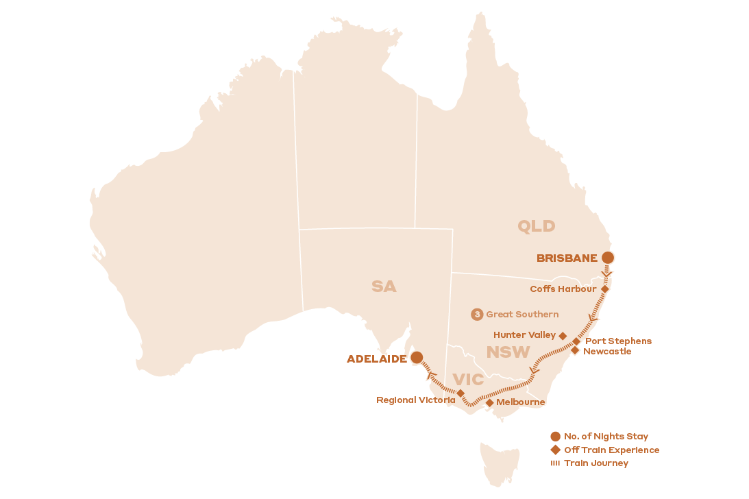 - 3 nights aboard the Great Southern, travelling from Brisbane to Adelaide