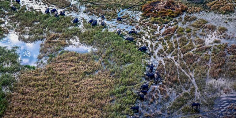 Take in the views on a scenic flight into the heart of the Okavango Delta. Climb into a mokoro (dugout canoe) and glide along the waterways around our remote camp to catch a first glimpse of the area’s abundant wildlife. Settle into comfortable tents, explore the camp, or opt to go for a swim. After lunch, embark on a wildlife cruise, watching for hippos and elephants as well as aquatic birds drawn by the region’s unique fish and insects. Enjoy a sundowner deck back at the camp before dinner under the stars.