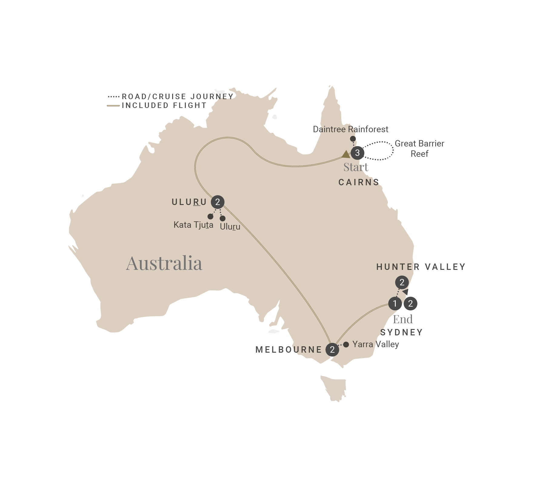 Adventure across Australia on this 13-day guided tour. Just outside of Cairns, explore the tropical rainforest of Daintree National Park with a Local Expert, who will teach you about the indigenous Kuku Yalanji people who live there. Fly to Uluru, where a guide will lead you through the Walpa Gorge and past its red, rocky domes. Later, watch as 50,000 solar powered lights illuminate the desert during its Field of Light display by Artist Bruce Munro. Explore Melbourne's laneways and visit the Yarra Valley for a chocolate masterclass, winery visit and gin tasting. Cruise the Sydney Harbour, then go inside its famous Opera House for a VIP tour. Celebrate your incredible trip with dinner at Bennelong Restaurant, set inside the opera house’s iconic sails.