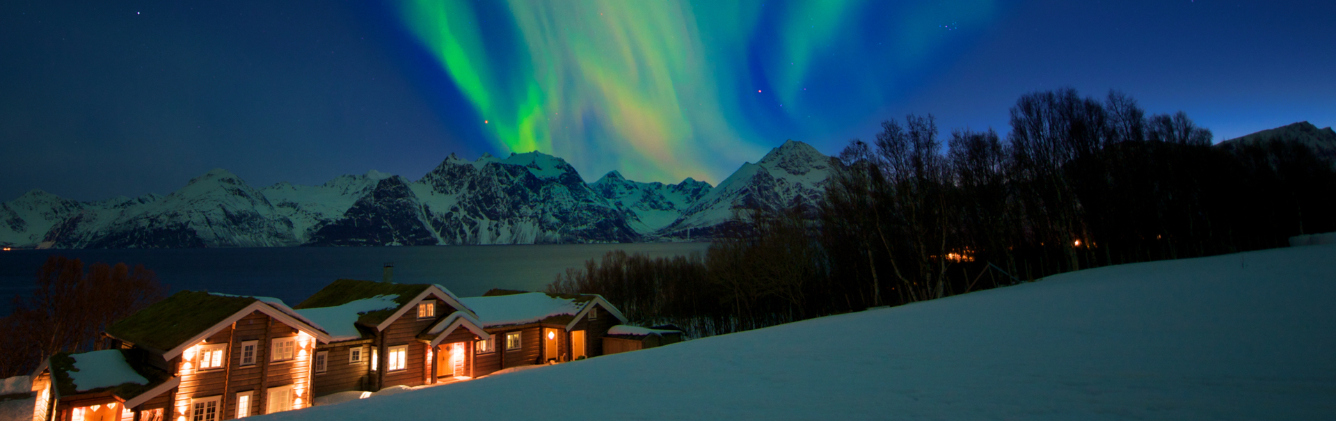 Just east of Tromsø lies the Lyngen Alps where you will stay in a traditional Norwegian timber lodge, Lyngen Lodge, beautifully situated on the fjord. This is a perfect and tranquil place to observe the Northern Lights, combined with daytime activities such as dog sledding, snowmobiling, sea safaris skiing, whale watching or snowshoeing. In-house Northern Lights photography assistance and a Northern Lights fact seminar enhance your understanding and experience.