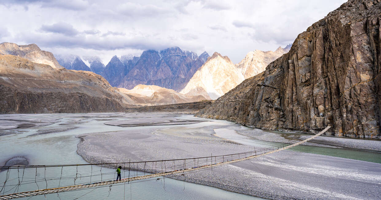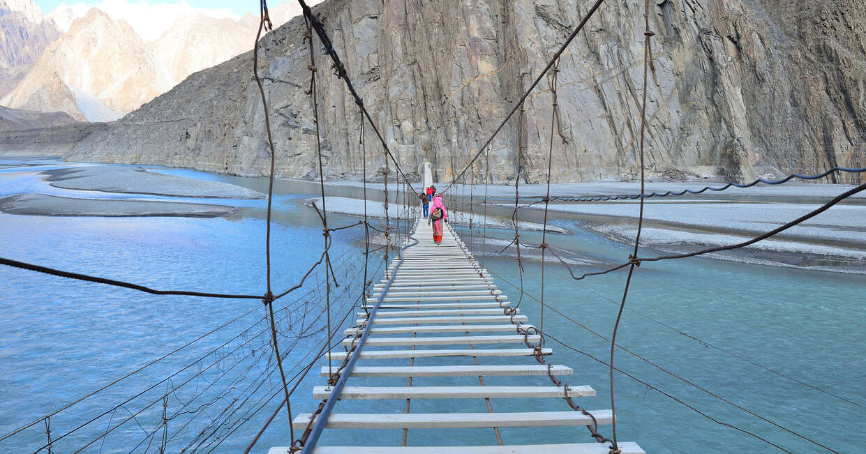 In the afternoon, we drive to Passu, stopping to see (but not cross!) the famous Hussaini Suspension Bridge. Spanning 64 meters across the Hunza River, this precarious structure\emdash made of widely spaced, weathered wooden planks bound by steel cables\emdash remains a crucial lifeline for locals transporting goods and agricultural produce across the rushing waters below. After observing the activity on the bridge, we continue towards Passu, pausing at Borith Lake for lunch and breathtaking views of the Passu Glacier.