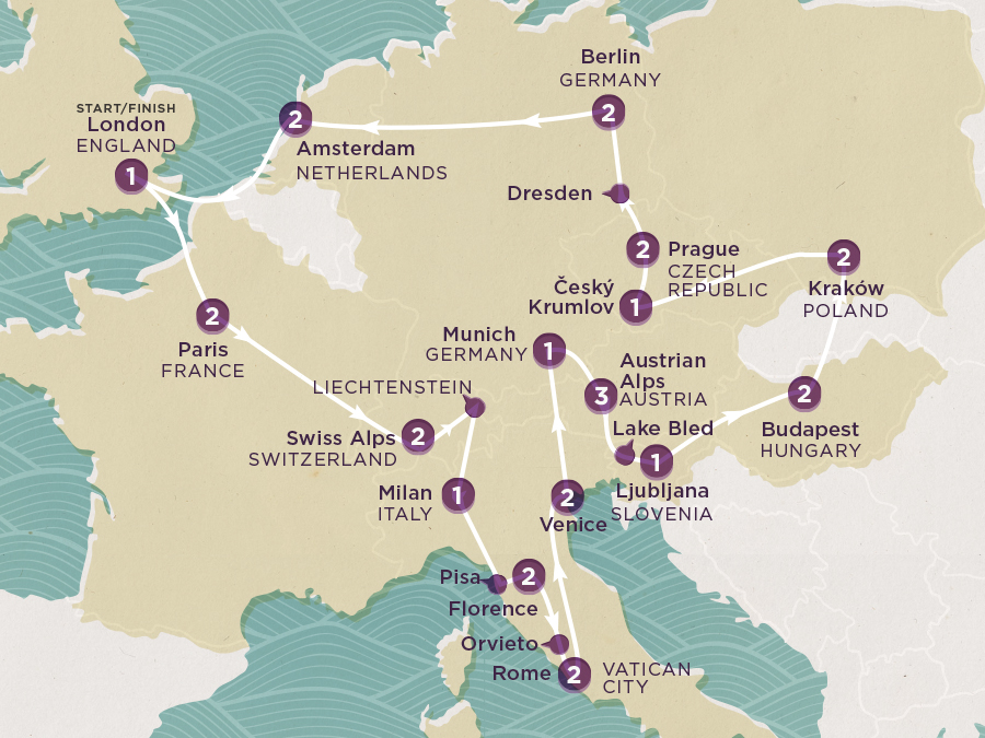 Great expectations? You should have. This immense wintery adventure around Europe’s most enchanting cites and spellbinding landscapes is the REAL fairytale. Discover the legendary capitals of Paris, Rome, Berlin and Amsterdam. Mix in the myths of Eastern Europe. And sprinkle the snow-capped peaks of the Swiss AND Austrian Alps on top. This trip is pure magic. Trust us.