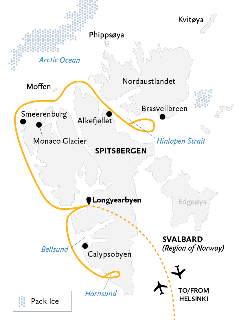 Svalbard is a true Arctic environment, where many iconic species spend their entire lives, entwined with the winter and spring sea ice. But with the arrival of summer—brief as it is—the archipelago bursts to life as countless migratory species settle in to take advantage of the season’s endless daylight and abundant food. Chief among Svalbard’s summer migrants are seabirds, waterfowl, and other birds, joined by marine visitors such as baleen whales—including the mighty blue whale. Though wildlife sightings aren’t guaranteed, these giants are sometimes observed foraging in the rich Arctic waters. Under the midnight sun, plant life also flourishes. While less diverse than in southern regions, Svalbard hosts hundreds of plant, lichen, and moss species, from hardy grasses to vibrant wildflowers. For a few brief months, snow and ice are replaced by pockets of green and splashes of color, framed by snowcapped peaks —a fleeting transformation of the High Arctic landscape. Throughout the summer, sea ice fractures, melts and disperses. Many species that depend on it shift north and east where ice lingers, or remain ashore until it returns in late fall. While ice may be less frequent, the open water offers greater access to the archipelago’s northern and eastern reaches. If we do encounter ice, we’ll pause to explore it. At this time of year, wildlife is more often spotted in the water, along shorelines, or gathered in bustling bird colonies clinging to the cliffs. Some terrain here is nearly vertical, with seabirds colonizing every possible ledge. Little auks, guillemots, and puffins nest in rocky crevices, spending the brief summer flying back and forth to feed themselves and their chicks before their f irst flights and plunges. Looking upward while seated in a Zodiac, the sky may seem alive with more birds than you can count, and sometimes we’ll explore near these cliffs on foot. Keep watch for other iconic species too, such as Arctic terns, common eiders, and the occasional king eider. The sounds are astonishing—an Arctic “silence” feels alive with nature’s calls. Standing beneath towering seabird cliffs renders visitors speechless. Summer offers the chance to step ashore and walk on bare ground, though patches of snow can linger. We may hike into foothills, valleys, and Arctic beaches— land shared with polar bears. While sightings are farther inshore, their paw prints in sand or mud tell their story. Take time to look around and underfoot, where hardy vascular plants and wildflowers bloom. You might also spot driftwood—not from ancient Svalbard forests, but carried here by Arctic currents from Siberia, where tree trunks and branches are swept up in the Arctic currents, ultimately coming to rest here. Additionally, we may see reindeer, as they busily forage on the bountiful summer plant life. Although the weather in midsummer is often cool—even crisp—in midsummer, it’s possible to enjoy reasonably warm days in Svalbard. It’s a surreal experience—feeling the warmth of the summer sun knowing you’re less than 700 nautical miles from the North Pole. As summer warms and sea ice recedes, glaciers come alive—meltwater hastening erosion, tidewater glaciers calving ice with thunderous force. From a Zodiac amid icebergs and brash ice, listen for the crackle of melting ice, the lap of currents, and Arctic terns calling overhead. During summer, if conditions align, it might also be possible to visit some of Svalbard’s residents, be they trappers or researchers. There are a number of trappers’ cabins dotted across the archipelago, and the stories their occupants tell bring forth a life wrapped in resourcefulness, grit, humor, and hints of something approaching the magic of nature. With seven full expedition days in Svalbard, we aim to explore a wide range of locations. The order of our journey will be shaped by sea ice conditions, which vary daily. Potential destinations include the spectacular fjord systems of Hornsund, Bellsund, Isfjorden, Krossfjorden, Smeerenburgfjorden, Raudfjorden, Woodfjorden, Sorgfjorden, and others. These fjords feature dramatic mountains rising directly from the sea, folding into endless layers. Glaciers spill from the highlands, many reaching the water’s edge where they calve into the sea. Throughout Svalbard, we may find previously mentioned seabird colonies and other wildlife, as they are distributed throughout the archipelago of islands.