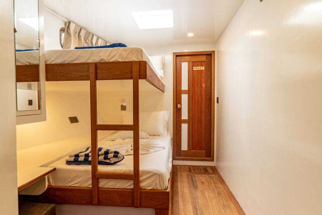 This trip is accommodated entirely on board a dhoni style boat (a traditional wooden motor sailing boat). All cabins have one set of twin bunk beds, an ensuite bathroom, and all cabins are located on the lower deck.