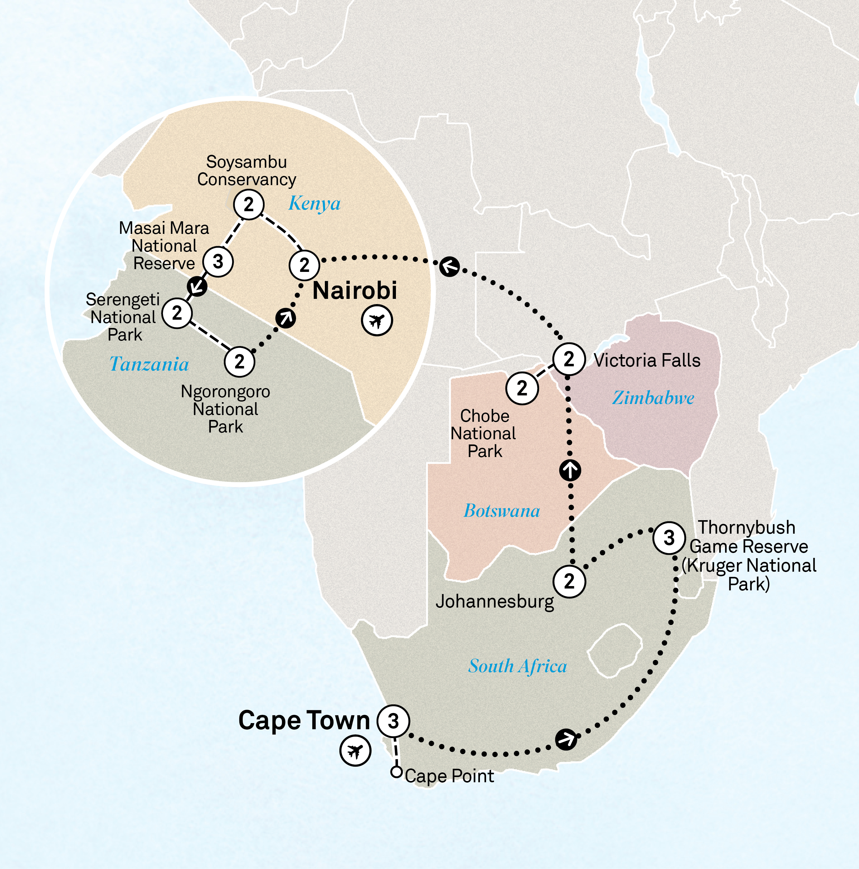 - Scenic Special Stays in Cape Town, Kruger National Park, Victoria Falls, Serengeti National Park and Ngorongoro Conservation Area