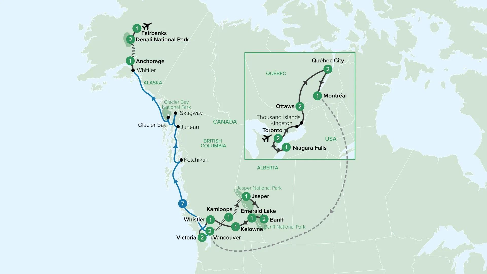 From east to west, explore Canada’s cities and spectacular Rocky Mountain scenery. Then board your Holland America Line cruise in Vancouver to discover Alaska’s Inside Passage and Glacier Bay, before heading inland to Denali National Park.