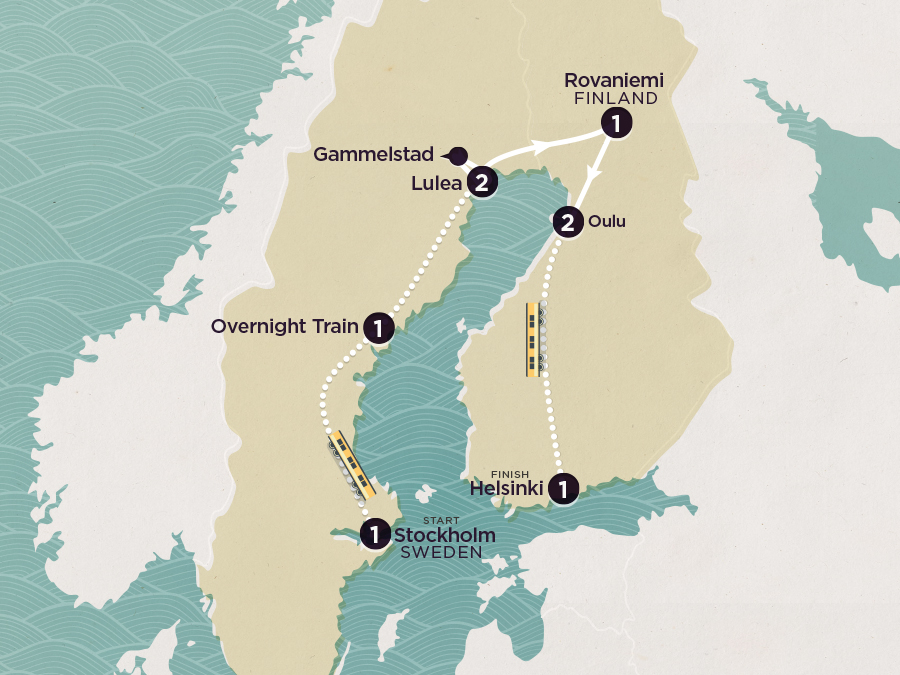 - 6 nights in hotel-style accommodation (twin or double), 1 night in a glass igloo (twin or double), 1 night on an overnight train (multi-share)