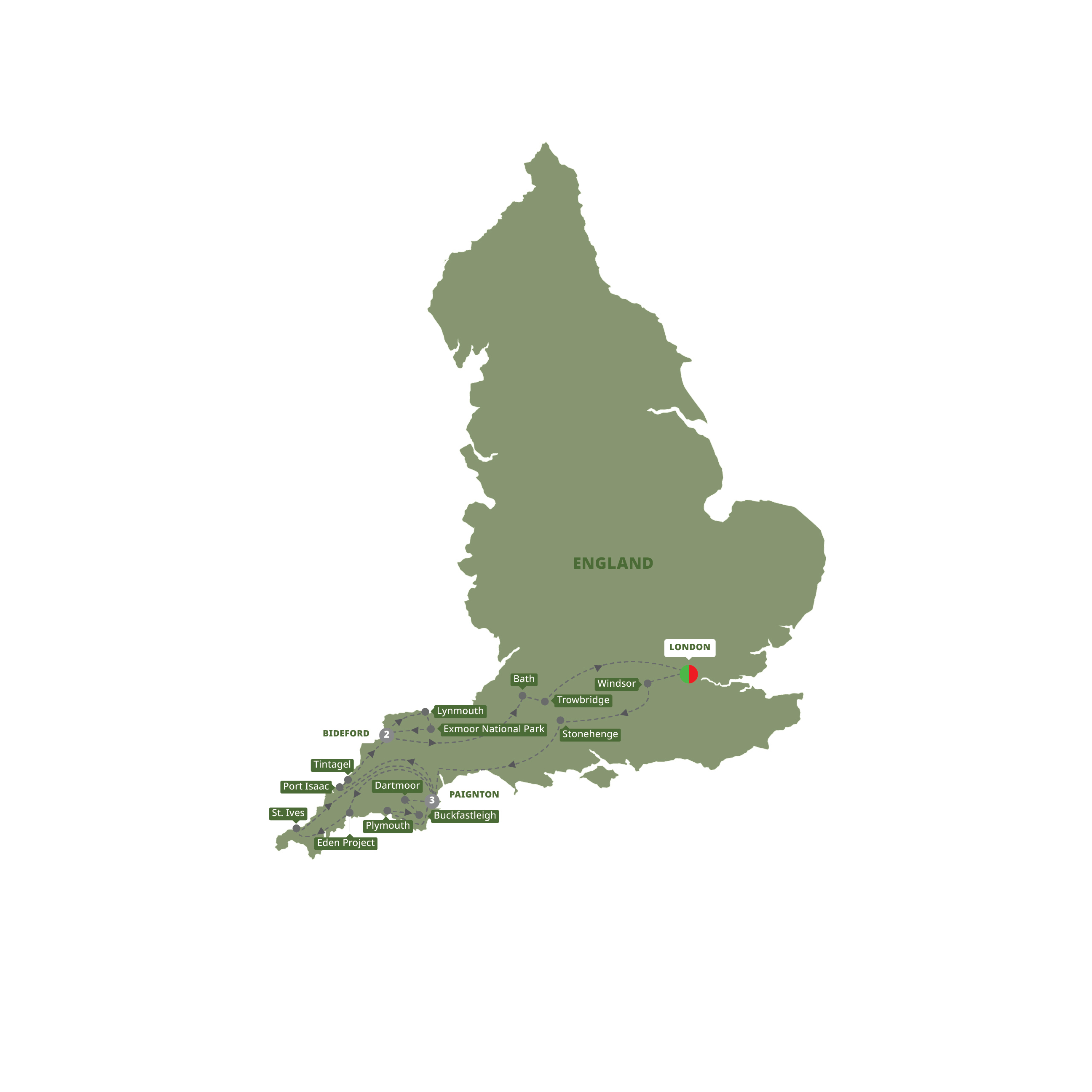 - Visit The ancient stone circle at Stonehenge, the artists' colony of St. Ives, Buckfast Abbey in Buckfast, Port Isaac, Dunster, the Roman Baths in Bath