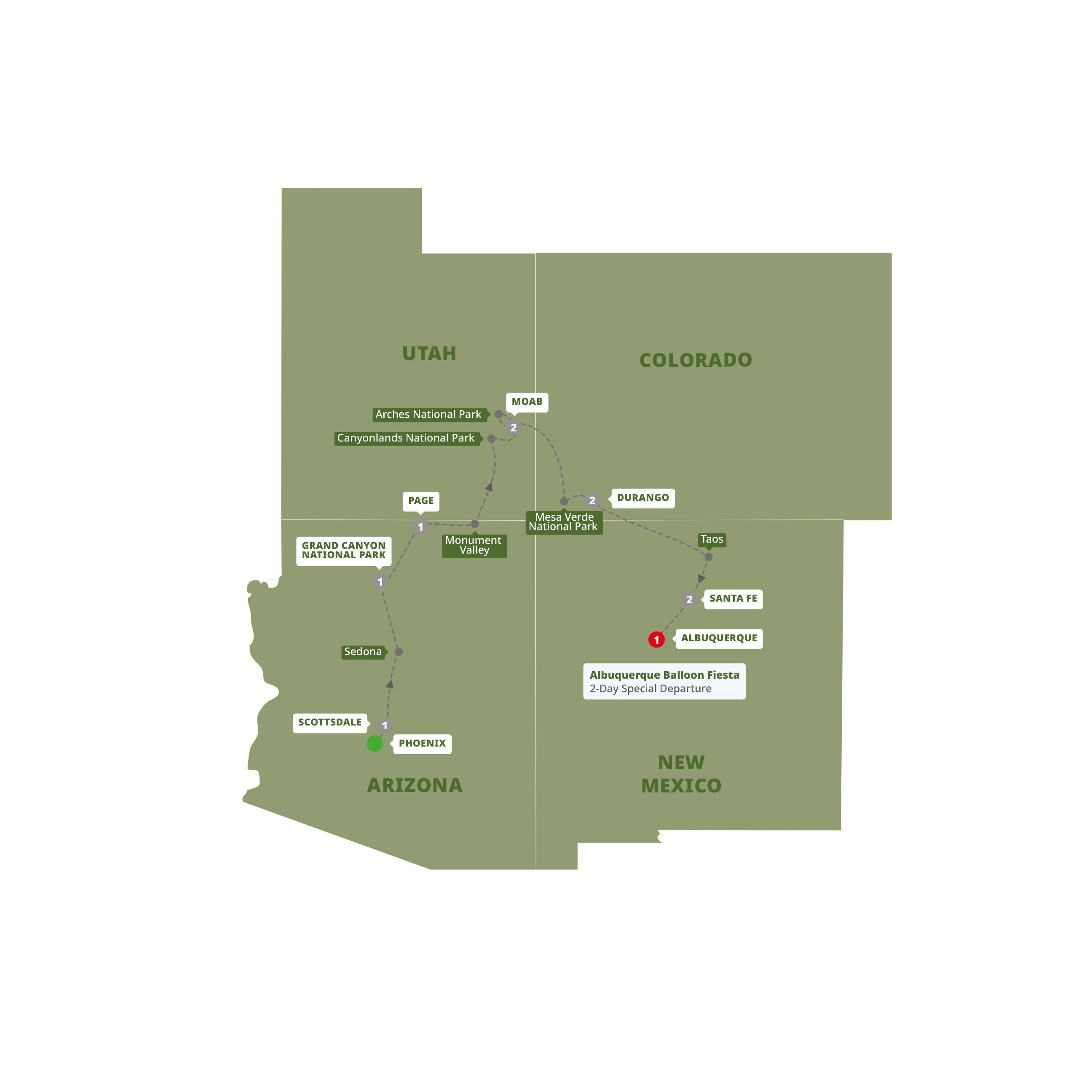 - Visit Scottsdale, Cameron Trading Post, Horseshoe Bend Lookout, Moab, Arches National Park, Canyonlands National Park, Mesa Verde National Park, Durango, Santa Fe