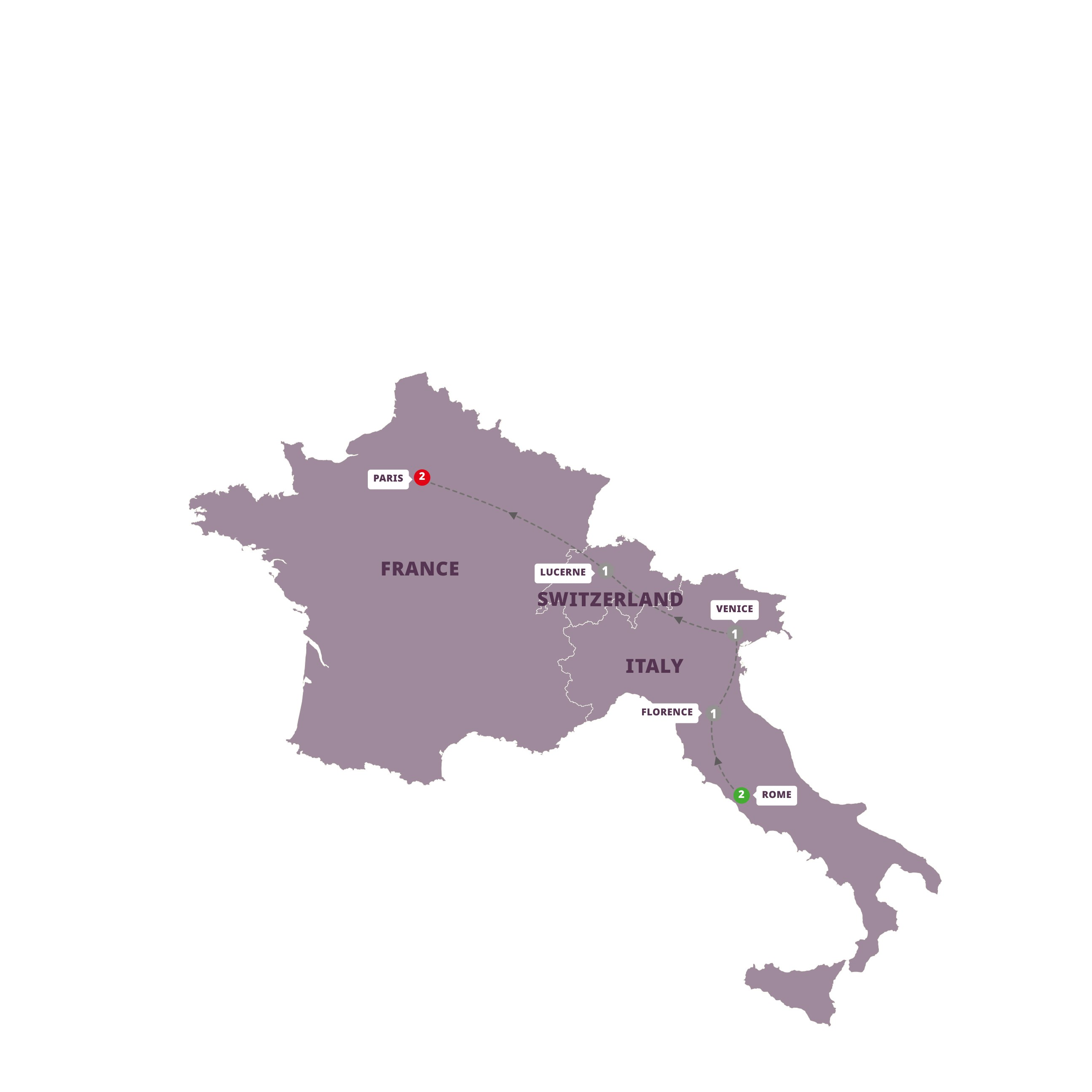 - View the Colosseum and other ancient sites in Rome, St. Mark's Basilica in Venice, the Lion Monument and the Chapel Bridge in Lucerne, the Champs-Élysées and the Eiffel Tower in Paris