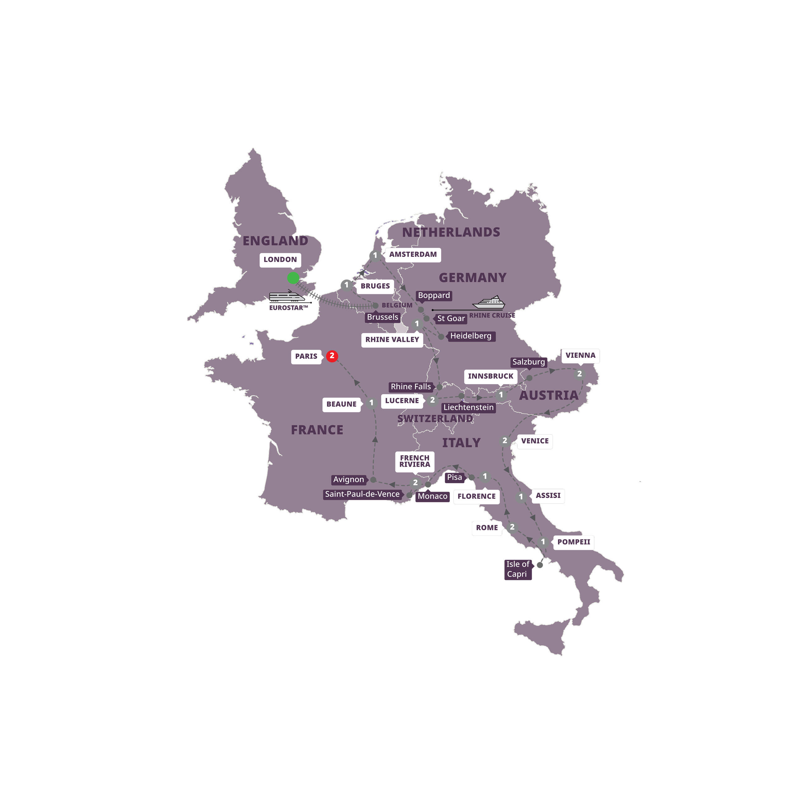 - Discover Amsterdam, Heidelberg, Lucerne, Innsbruck, Venice, Pisa, Monaco and Avignon