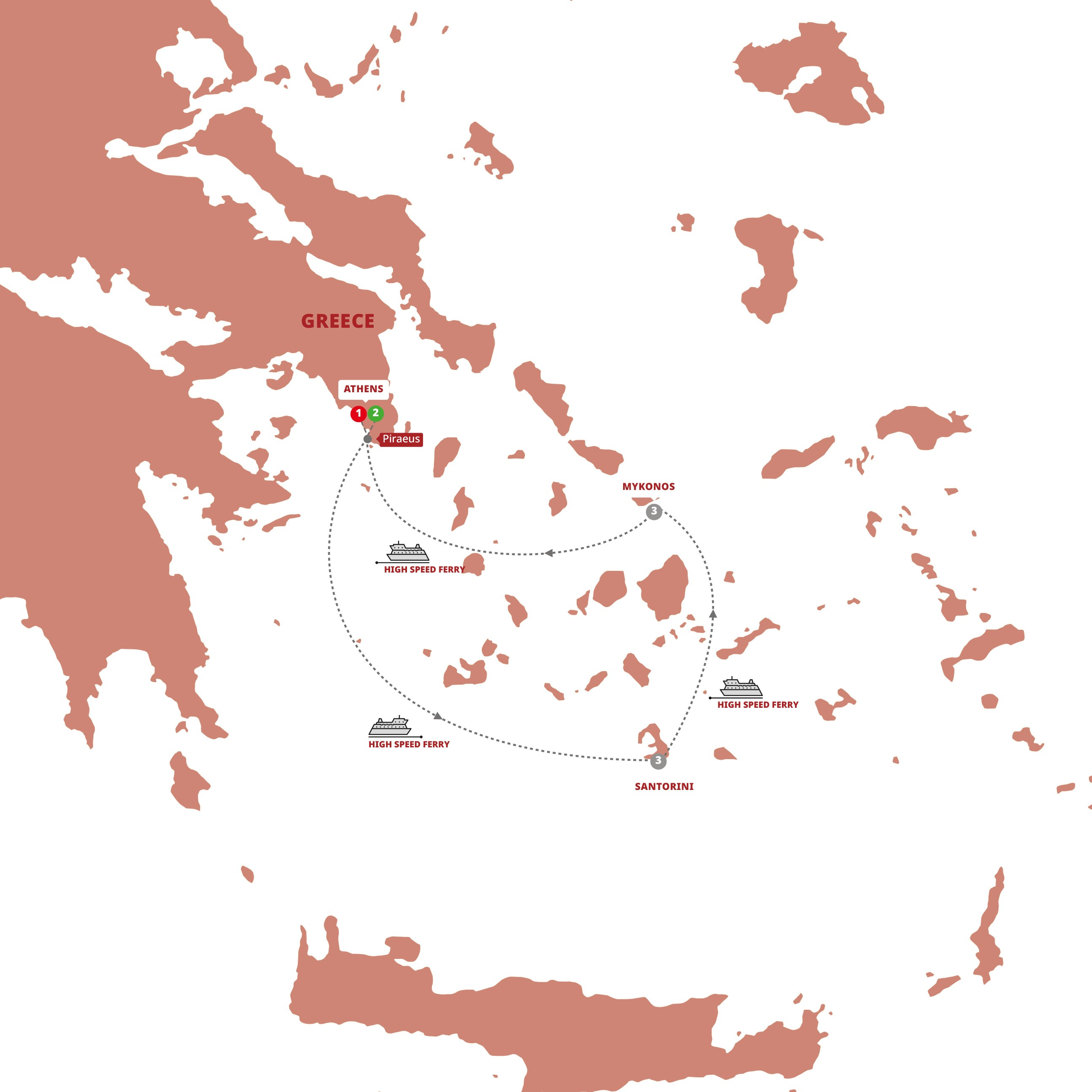 - Sail the Aegean Sea on high speed ferries from Athens to Santorini, Mykonos and returning to Athens