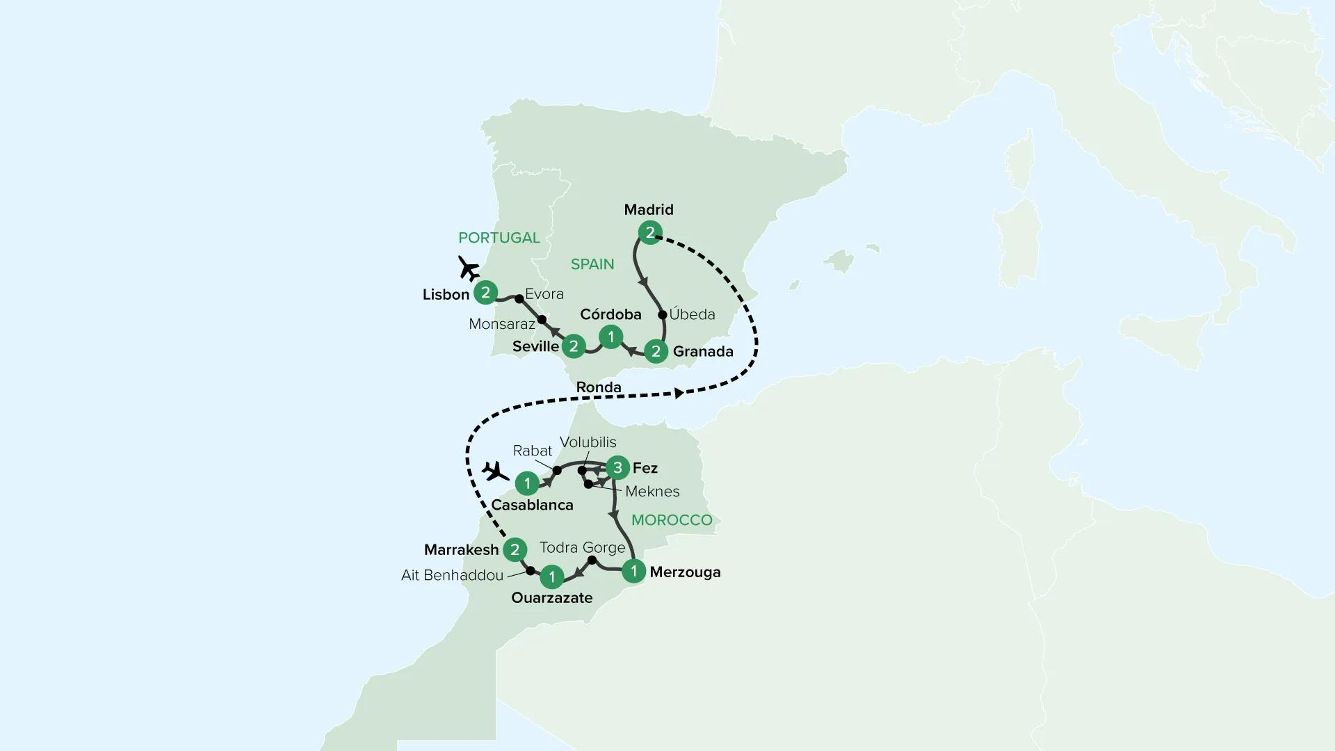 Uncover the soul of North Africa and the Iberian Peninsula on this 18-day journey from Casablanca to Lisbon. From Morocco’s imperial cities and golden deserts to Spain’s Moorish marvels and Portugal’s timeless charm, this curated itinerary blends rich history with refined comfort. Wander through ancient medinas, dine in centuries-old cities, and stay in handpicked boutique accommodations. With immersive cultural encounters and seamless travel across three countries, this is a journey designed for the discerning explorer.