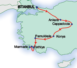 This small-group tour, limited to a maximum of 28 people, starts in Istanbul and continues to Cappadocia and Pamukkale before reaching Fethiye for a seaside break in this magnificent area. The tour concludes in Fethiye with a transfer to either Fethiye or Marmaris port. Accommodation is in first-class hotels, with the services of an English-speaking guide included.