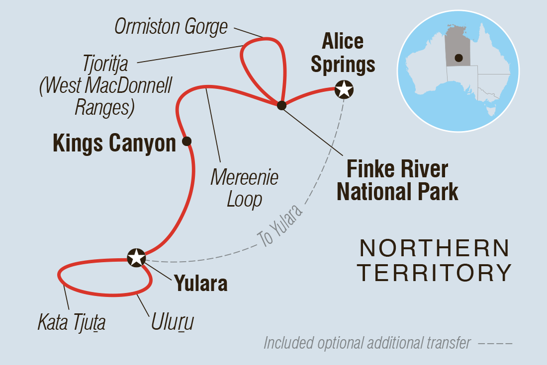 The trip starts on day 1 either in Alice Springs with a pick up from Stay at Alice Springs Hotel at 8:30 am or with a Welcome Meeting at 4pm in Yulara at our joining point hotel. Please advise us of your preferred start location at the time of booking. The trip finishes in Alice Springs on the last day (day 6) mid-morning. We recommend you book your departure flight from Alice Springs no earlier than 12:30pm on the last day. Accommodation is not included on this day but can be booked on request.