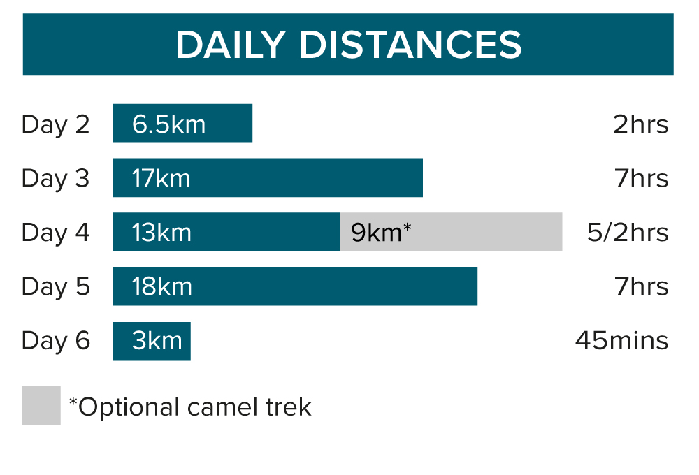 A week long adventure packed with awe inspiring walks and Jordan's unmissable highlights|Walk into Petra from the back door and hike through its magnificient tombs and temples|Trek across the dunes of Wadi Rum and stay overnight at a traditional Bedouin camp