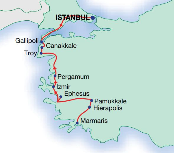 The tour begins in Marmaris and ends in Istanbul. After departing from Marmaris, visit Pamukkale, Ephesus, Pergamum, Troy, and Gallipoli, before arriving in Istanbul for a one-night stay and airport transfer. The tour includes accommodation in first-class hotels and the services of an English-speaking guide.